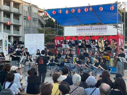 大淀中学校吹奏楽部、通称「淀水」が、美豆小学校で開催された地域の「淀南ふるさとまつり」のステージで演奏しました。淀水の演奏を地域の皆さんが楽しみにしてくださり、16:40の演奏スタートから観客がどんどん増えていきました。1曲目は、ふるさとまつりにちなんで「夏祭り」の演奏です。みんながよく知ってる曲目に、自然と歌を口ずさんでしまいそうになります。2曲目は「アンパンマンのマーチ」です。アンパンマンのマスコットを持ちながらかわいらしく曲紹介をし、聞いてくれた小さな子たちも淀水の演奏にくぎ付けになっていました。3曲目は「世界の国からこんにちは」。今、熱い大阪万博にちなんだ曲です。そして4曲目はMrs.GREEN APPLE「点描の唄」。演奏の前にミルクボーイの漫才をまねた曲紹介で観客を楽しませます。人気の曲目の演奏に、見に来てくれた大淀中生も喜んでいました。最後のアンコール曲は「風になりたい」。手拍子も出て、ステージは大盛況。大きな拍手で演奏を終わりました。
