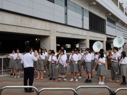 吹奏楽部は、大きな楽器を抱えて淀の町で演奏します。1カ所目は淀本町商店街の入り口です。人通りもあり、立ち止まって聞いている人たちもいます。2カ所目は、淀競馬場の近くでこちらも駅に向かう人たちが聞いています。保護者の方々も写真を片手に応援してくれています。楽器を持って移動するのは大変です。吹奏楽部のみなさん、いつも地域のために演奏してくれてありがとう。