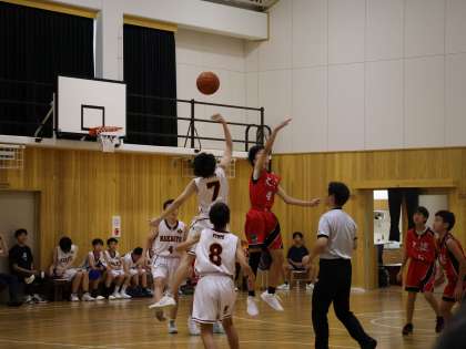 大淀中学校での公式戦。ホームの有利さを生かしたいところです。しかし、観客が多いことで少し緊張しているようにも見えます。第1Qは、先制点を決められるが離されないように常に追いかける展開です。拮抗した試合になりそうです。第1Q16対18です。