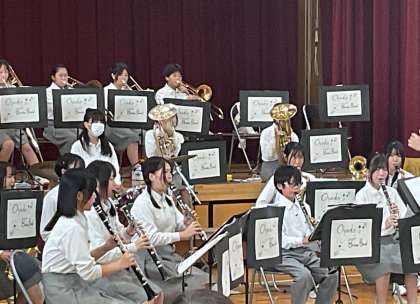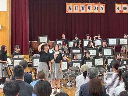 途中、司会を交替しながら楽しく曲紹介をし、みんなが知っている「風になりたい」や、ラテンのリズムに乗れる「TEQUIRA」が演奏されました。1,2年生だけの合奏「Banana Split」や2,3年生だけの合奏「Lets'swing」 3年生だけの合奏「We Aer Confidence Man」と、自分たちも楽しみながら、聞いているお客様にも楽しんでもらえる趣向が満載でした。今はやりの「点描の唄」、聞いているだけで宇宙旅行をする気分になれる「銀河鉄道999」が、次々と演奏され1時間半があっという間でした。