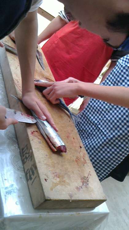 写真は『集合時』『魚のおろし方体験』『カゴ漁』です。