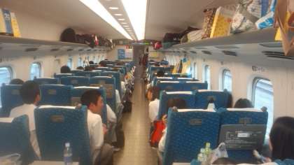 みんな疲れも見せず,楽しそうに談笑しています。棚の上にはお土産らしき紙袋が並んでいます。後1時間弱で京都駅到着です!