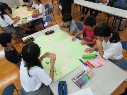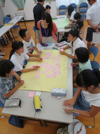 メインは「大淀学区学びのルール」の中にある、「物を大切にしよう」「決まりを守ろう」について、小中3校で具体的な取組をグループワーク形式で討議し、発表することです。アイスブレーキングでみんなの距離がグ〜ンと近くなり、結構活発な話し合いができていましたね。中学生のリードもなかなか良かったですよ!