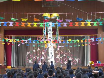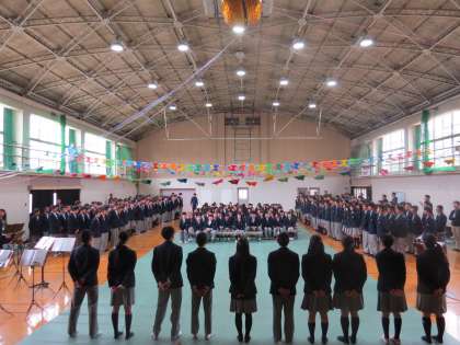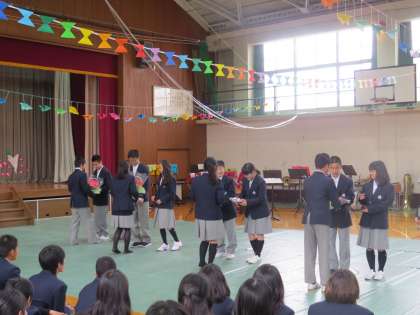 その後、2・3年生からは大淀中の愛校心の象徴である「校歌」のプレゼントがありました。1年生も早く覚えて一緒に歌えるようになってくださいね。