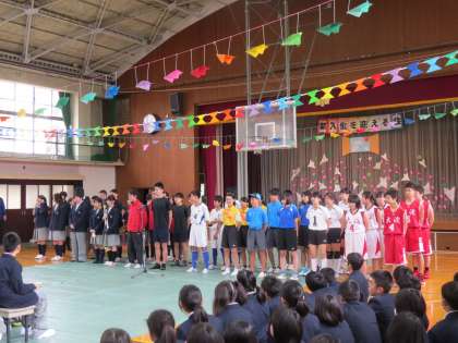 その後、各部活動代表者による部活動紹介です。キビキビとした動きと礼儀正しい挨拶など、新入生の模範となる所作でしたね。実際の紹介では、とても工夫を凝らした女子テ○ス部には、いい意味で驚きました。こんなキャラクターが隠れていたなんて…。今後の活躍も期待してしまいます。