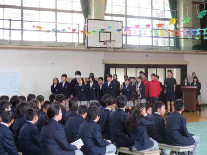 まずは、生徒会本部から生徒会活動と各委員会活動について説明があり、もうすぐ決まる各学級役員への積極的な立候補の呼びかけをしてもらいました。