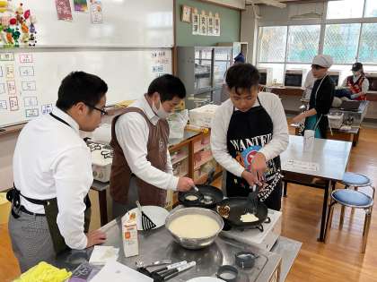 開店に向けて、調理器具のの片づけや、テーブルのセッティング、飲み物の準備もみんなでやりました。どら焼きの生地は冷蔵庫で寝かせていたので、開店直前に焼きます。先生の手を借りなくても、自分たちだけで職人のようにどんどん焼いていきます。調理室からいい匂いが漂って、休み時間にのぞきに来る他のクラスの人もいました。