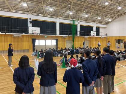 今日の午後は、明親小、美豆小の6年生が中学校の授業や部活動を体験しに来てくれました。始めに体育館で新生徒会本部役員が「新しい友達を作るチャンスです」と挨拶をしてくれました。その後、各授業場所に移動し、45分間の中学校授業の体験です。それぞれの教室には新生徒会本部の人が数人入り、小学生の学習の補助をしてくれました。西校舎では、社会、数学、英語の授業、北校舎では国語、理科の授業が行われました。数学の授業ではくじを引きながら確率の学習をし、理科の授業では二酸化炭素などを集め、気体の性質を探る実験をしていました。小学生の人たちも意欲的に授業を受けてくれました。