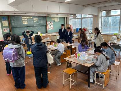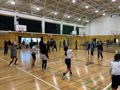 授業体験の後は部活動体験です。各部のキャプテンが小学生を迎えに行き、それぞれの活動場所で体験が始まりました。体育系の部活動では、それぞれの競技の基礎を中学生が教えます。小学生の人たちも、実際にラケットを持ち、ボールを触り、体を動かし、1時間弱の体験を楽しんでくれました。文科系の部活動でも、ものづくりを体験してもらったり、楽器を吹いてもらったりしました。美術部では絶賛製作中のクリスマスツリーの枝葉の部分を、小学生にも作ってもらいました。出来上がりが楽しみです。小学生のみなさん、来年度、大淀中学校で一緒に学べることを楽しみにしています。