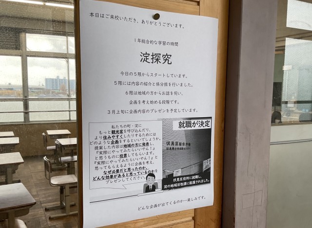 先週金曜日、1年生は総合的な学習での「淀探究」が始まりました。5時間目に説明を聞き、6時間目は5つのグループに分かれて、私たちが住む淀の地域について、地域の方からお話を聞きました。淀本町商店街の方、與杼神社の方、農家の方、河津桜を守っておられる方、埋蔵文化財研究所の方が、それぞれの視点からの淀の歴史、文化、自然、特徴などを、熱心にお話ししてくださいました。6時間目はちょうど参観日だったので、保護者の方も一緒に聞いていただくことができました。1年生はこれから伏見区役所の地域活性課配属の職員として、私たちの町・淀をさらに住みやすく、さらに活性化させる企画を考えて、地域の方々にプレゼンする予定です。どんな企画がでてくるか、とても楽しみです!