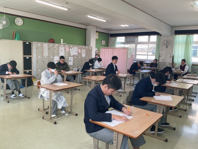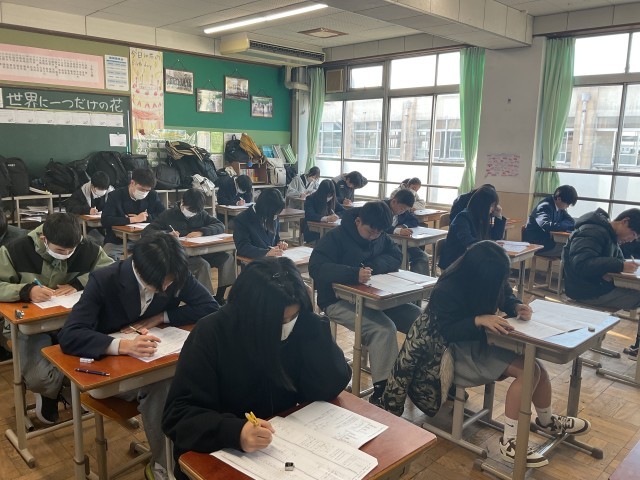 今日から1,2年生は学年末テストです。1組は全学年テストです。どのクラスをのぞいても、一生懸命取り組んでいました。日々の授業を頑張った人、家での復習を頑張った人、テスト前にしっかりとテスト勉強をした人、きっと良い結果が出ると思います。「頑張ってるのに、なぜかできない」と悩んでいる人、まずは、覚えるべきことを完璧に覚えることから始めましょう。覚えた知識をつなげて考えれば、思考力を問われる問題も徐々にできるようになります。あきらめず、粘り強く頑張る!そうすれば、1年後、2年後、必ず明るい未来が待っています。