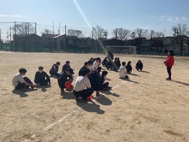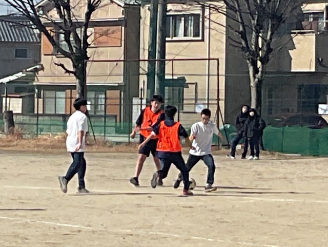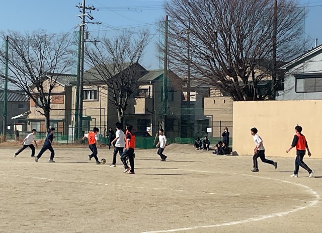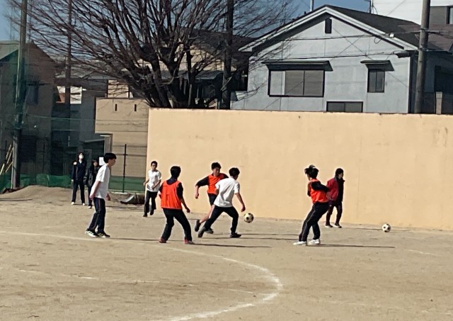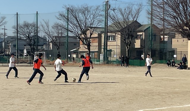 今日の3年生、体育の授業では、思いっきりサッカーを楽しむ姿がありました。授業の初めにボールコントロールの練習をして、その後は試合です。男子の試合が白熱して、それを休憩中に見学していた女子はそのまま応援に熱が入りました。試合中お互いに声を出し、パスを回し、シュート! キーパーも果敢にブロック! 応援も大きな声です。「あとワンプレーで終了」という指示が出た後の、最後のワンプレーまで真剣勝負でした。3年生は前期入試が終わったばかり。まだ中期入試に向けて張り詰めている気持ちを、快晴のグラウンドで発散するかのように頑張っていました。