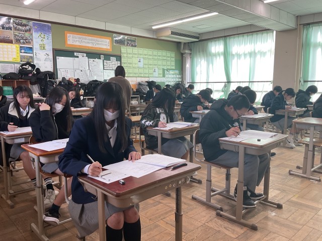 1・2年生と1組は、学年末テストの2日目でした。家に帰った後も、明日の向けてのテスト勉強ができているでしょうか。気持ちが乗らないときは、まず、机の前に座ってみる、教科書を開いてみる、シャーペンを持ってみる、という行動から始めてみてください。ある芸人がテストに向けて、真っ白い紙にひたすら漢字や単語、覚えるべき語句を書いて、文字で紙を埋め尽くしたら、すごい達成感だったと言っていました。こんなやり方で、やる気スイッチを押す人もいるんですね。やる気スイッチは自分でしか押せません。自分なりの勉強の仕方を考え、やり切ることが大切です。最終日の明日に向けて、できることはまだあります。がんばれ!