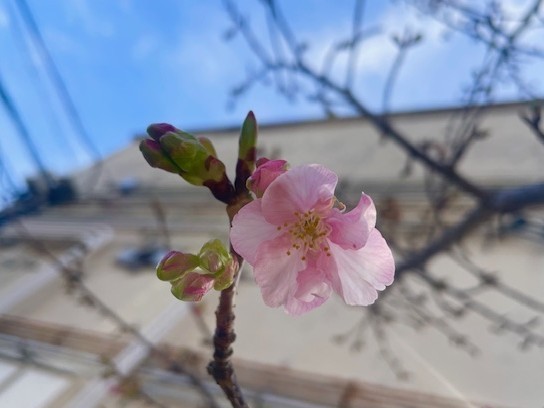 *写真は、学校の校門にある河津桜、今年一番に咲いた桜です。