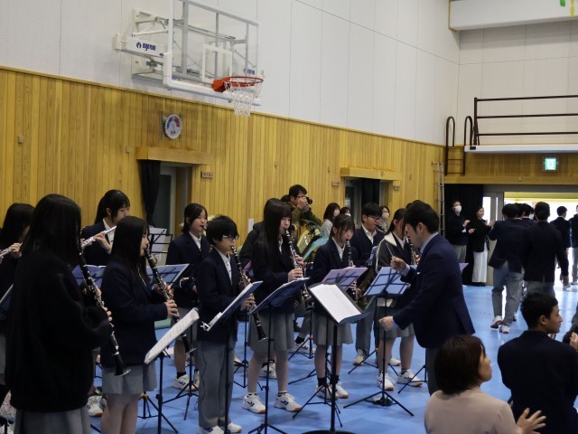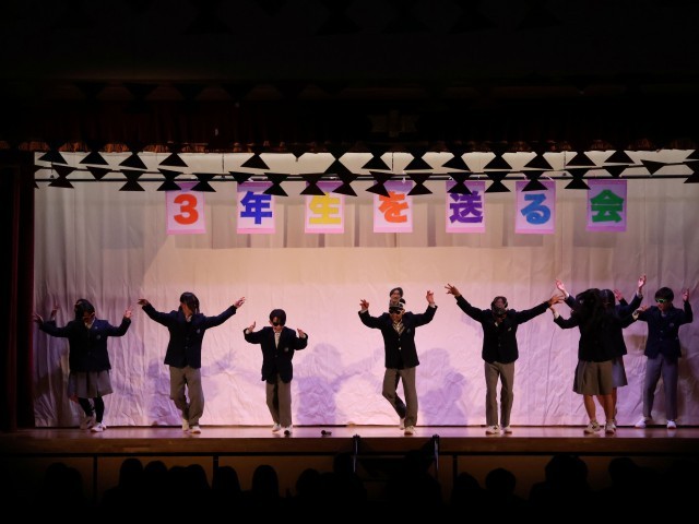 3年生を送る会が、最後の全校集会になります。吹奏楽部の演奏とともに3年生が少し緊張している様子で舞台上から登場。全員で歌う校歌を想いを乗せて歌ってくれています。まずは、生徒会本部役員が口火を切って笑いあり物まねありの見事な発表をしてくれます。そして、1年生は3年生に対する感謝をビデオと歌で届けます。2年生は、3年生と過ごした期間が一番長い学年として感謝の気持ちと歌を披露します。3年生も頼もしい後輩の姿に安心した表情を浮かべているように感じます。