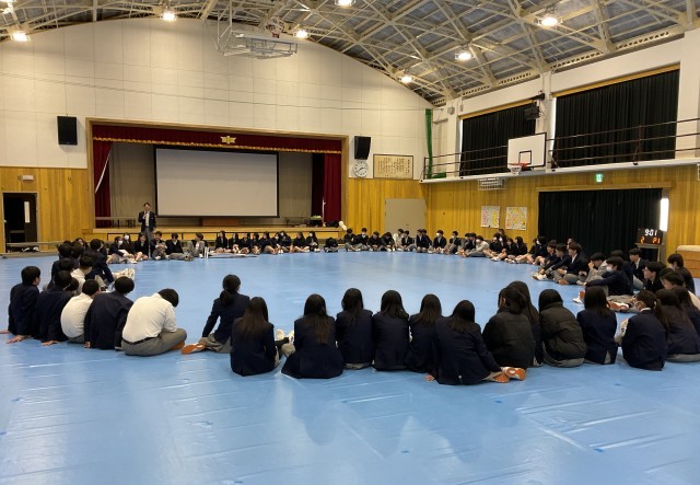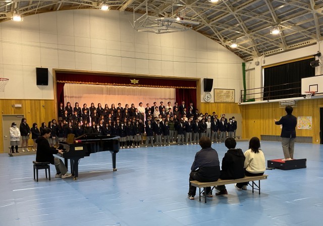 56限、体育館から大きな歓声が何度も聞こえました。3年生、最後の学年集会です。先生がつくってくださった思い出動画を見たり、全員で円になって一人一人思いの丈を話したり、仲間と先生との最後の時間を存分に楽しみました。先生方へのサプライズメッセージもあり、途中で涙する人も何人もいました。最後に、送る会で歌った歌と卒業式最後に歌うもう一曲を、かみしめるように、心ひとつに合唱する姿は、見ていて胸が熱くなりました。感謝の思いのあふれたすばらしい歌声でした。自分たちで司会進行し、自分たちで準備し、自分たちでフォローし合って動いている3年生の姿に、この3年間の大きな成長を感じました。
