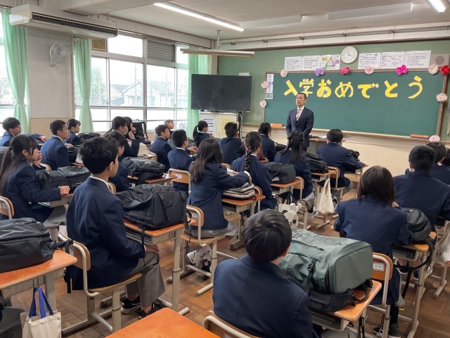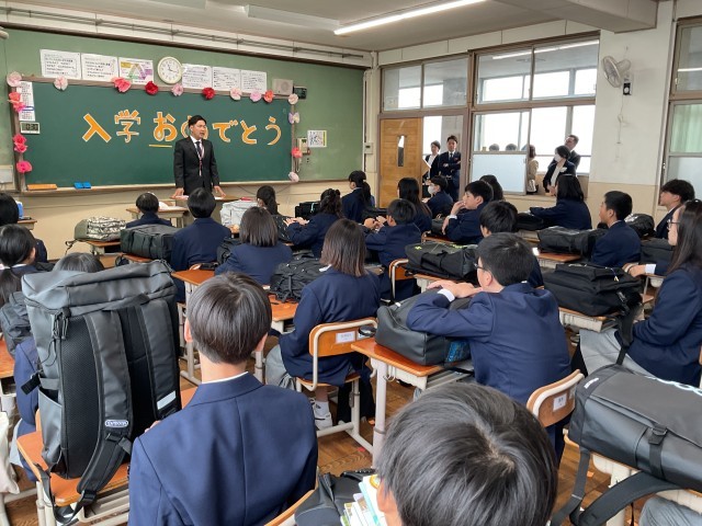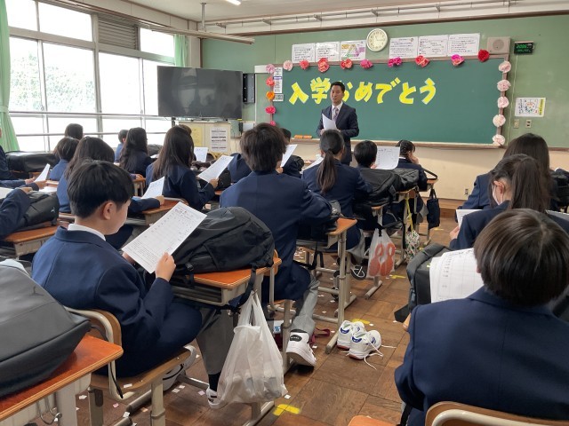 入学式後、初めての教室で、初めての先生と、そして、これから絆を結んでいく仲間たちと、初めての学活の時間でした。どのクラスの教室でも、先生たちが作ってくれたウェルカムムービーが流れました。「ありがとう」を大切にし、笑顔で登校でき、笑顔で過ごせ、笑顔で帰れる、そんな学年にしようというメッセージが込められたウェルカムムービーでした。 3年後、この出会いに「ありがとう!」と感謝できるような中学校生活にしてください。これから一緒に頑張りましょう!