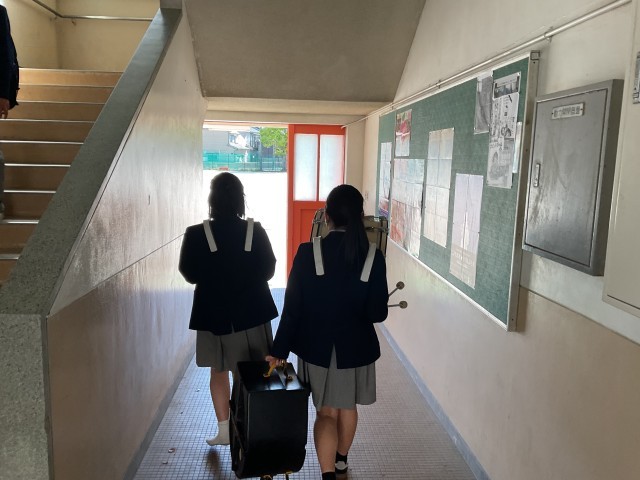 吹奏楽部は第二音楽室にある楽器を運び、西校舎での活動になります。自分の演奏する楽器とは違う楽器を運んでいる3年生に遭遇しました。