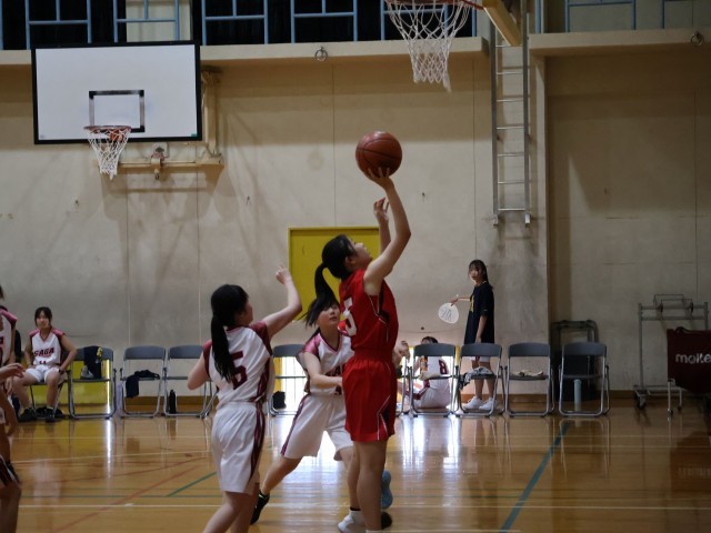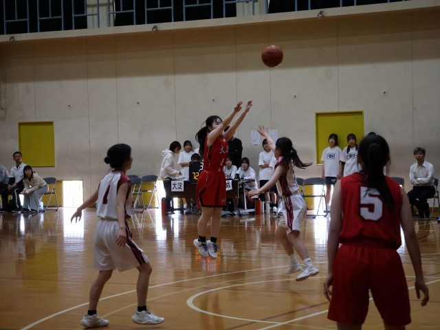 女子バスケットボール部の1回戦の相手は、嵯峨中学校です。1回戦ということで試合前の練習では少し硬さも見られましたが、試合が始まると自分たちのプレーが出来ているようです。前半は、少し点差も開き余裕が出てきたのか3ポイントシュートも決まり始めています。54-8と大きくリードして後半に入ります。