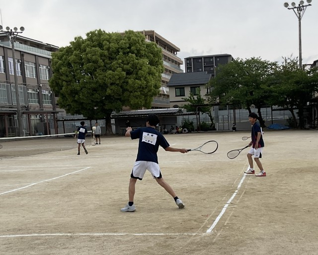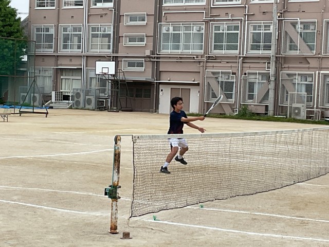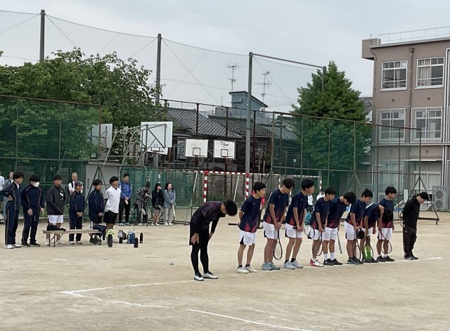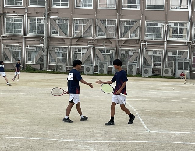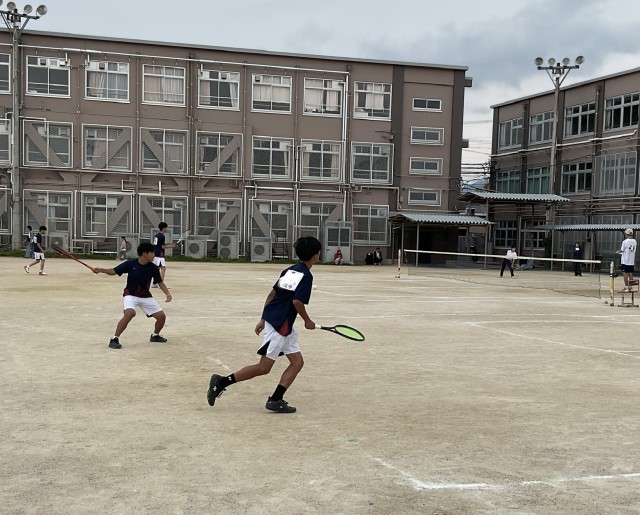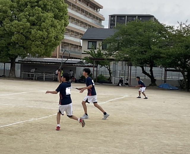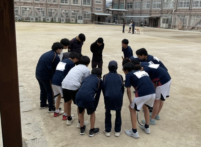 男子ソフトテニス団体戦、2回戦の相手は久世中学校です。1回戦と同じく、チーム一丸となって応援します。出場は1回戦と同じ3ペアです。声を掛け合い、気持ちを高め合って善戦しましたが、惜しくも2ゲーム取られ、負けてしましました。最後まで諦めず、ボールを追い、大きな声で応援したナイスゲームでした。試合終了後、涙する選手もいました。「泣けるということが素晴らしい。そのくらい気持ちが入って、一生懸命だったということ」とおっしゃってくださっている保護者の方もおられました。監督もコーチも「この経験を、次への糧にしてくれると思う」と言っておられました。 たくさんの応援に感謝し、次に向かってがんばれ、男子テニス部!