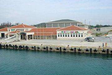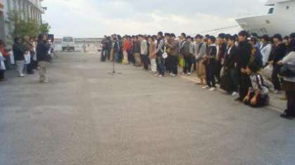 定刻通り、洛陽工業高校研修旅行団は伊是名島に上陸しました。今日は、波が高く船に酔った生徒もいました。下船後、仲田港で入村式を行いました。式の後、生徒たちは各家庭へと移動します。
