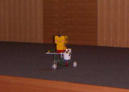 キーワードは「日常生活に密着」です。三輪車で飲み物を運ぶロボットとして、ライントレーサーを用い、コミカルな動作も加え、"Robo Cafe"を提案しようというものです。