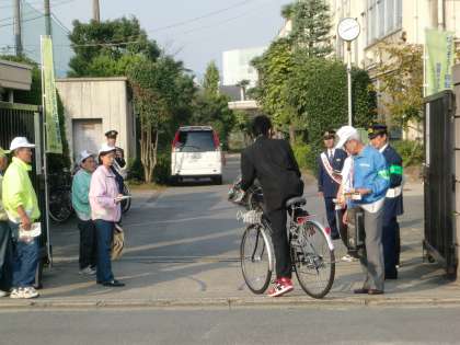 本日登校時に、校門で南警察署の皆さん、地域の防犯推進委員の皆さん、洛陽工業高校生徒会(輝き隊)の生徒諸君により啓発ビラおよびワイヤー錠の配布が「なくそう! 自転車の盗難被害」のスローガンの下行われました。生徒諸君は、今日配布されたワイヤー錠で「2ロック」にし、自転車の盗難を防止してもらいたいと思います。