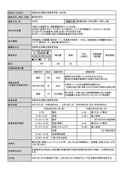 平成26年度京都市立洛陽工業高等学校の前期選抜の要項を配布文書に公開しました。前期選抜要項の一覧は教育委員会から各中学校へ冊子の形で配布済です。11/9(土)の学校見学会へ参加いただいた方には当日資料冊子の中で配布しています。