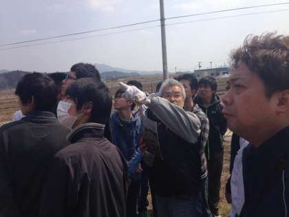 本日(3/25)陸前高田へ到着後、本プログラムのいちばんの目的である桜の植樹を行いました。苗木は参加生徒が自分たちで購入しました。これは、「陸前高田桜プロジェクト」が取り組まれている植樹活動に参加させていただいたものです。もともとはりんご園だったのですが、公園にされるそうです。