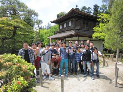 写真は銀閣寺から大文字山に行った京都ものづくりコースです。新緑がまぶしい銀閣寺を訪れた後、急坂を汗をぬぐいながら大文字山に登りました。真っ青な空のもとで、心地よい風に吹かれながらみんなで眺める京都の街は時間の経つのも忘れるほどの絶景でした!!