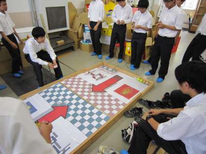 1年生の創造基礎で製作したプチロボによる競技を行いました。ボード上の硬式・軟式のテニスボールとピン球の合計7個を相手陣地に数多く入れた方が勝ちというルールで、4名でチームを構成しリーグ戦で対戦しました。試合に先立ちチーム内で戦略を立てて各人の役割分担を決め、プチロボ自体も改良してチーム全体で戦います。