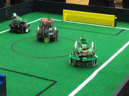 この競技は自律型ロボットによるサッカー競技です。選手はスタートスイッチを押したらその後は触ることができません。ロボットは事前にプログラムされた通りに自動で動きます。このロボットで2vs2のサッカーを行い、得点を競います。