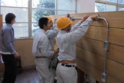 電気コースでは、先日電気工事に関する特別技能講習を行いました。本校OBで電気工事におけるエキスパートである「現代の名工」に選ばれた技術者と、現場の最前線で指揮をとっている優秀技術者を招き、電気工事士の資格取得やものづくりコンテストの電気工事部門にチャレンジする土壌を培うことが目的です。参加した生徒は電気工事のプロのレベルの高さを認識することができ、触発されて学習意欲の向上に繋がるよい機会になったと思います。