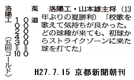 <京都新聞記事>野球部(洛陽工‐莵道戦)記録記事(H27.7.15)