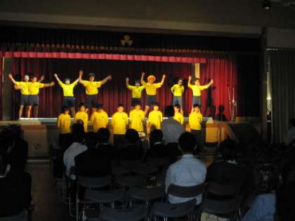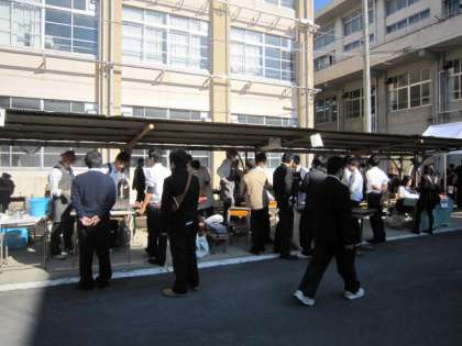 朝から校内では多くの模擬店が立ち並び、焼きそば、焼き鳥、みたらし団子、フライドポテトなど調理が始まっているところです。講堂では各クラスのステージ発表が開催、ダンス、合唱、歌、音楽劇などが次々と行われています。