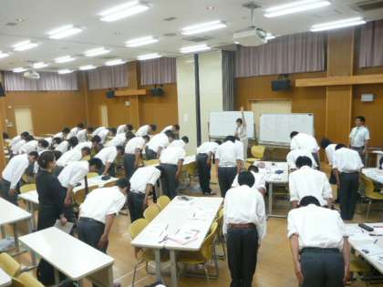 7月28日(土)、本校視聴覚室において、厚生労働省主催「就職ガイダンス<3年生対象>」を行い、就職希望の本校3年生47名が参加しました。挨拶の姿勢・座席での姿勢の指導や、アイコンタクトの重要性、言葉で説明することの難しさ、伝えたいことを伝えるためのコツなどのレクチャーやゲームと、次々とメニューをこなし、最後に模擬面接に取り組みました。今日のトレーニングで学んだことをもとに、就職選考までの1ヶ月半、しっかりと準備をしてほしいと思います。