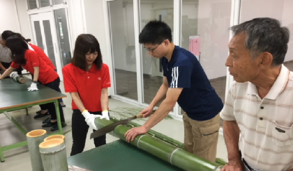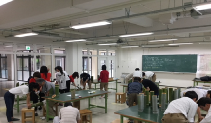 プロジェクトテーマ『くらしをイノベーションしよう!』の一班では,『高齢者の避難をイノベーションしよう!』をアプローチテーマとして活動を行っており,先日の7月3日(火)に,砂川学区および龍谷大学社会福祉学部の窪田ゼミの学生の方々と協働で,8月に行われる川久保町の地蔵盆で使用する竹灯篭を作製しました。