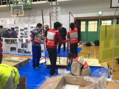 新聞紙で簡易のスリッパを製作したり,災害時における緊急用トイレの組立等を実施しました。「年をとると膝が曲がりにくく,和式のトイレではつらい」などの声を聞くことができ,今回の活動を通して,災害時における多くの新しい視点を気づかされました。