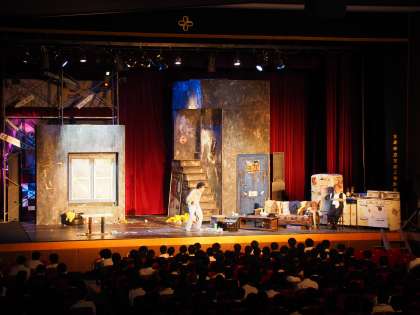 演劇鑑賞会では,本物の舞台芸術に触れ,生徒の自身の豊かな感性をはぐくみ,いろいろな立場や目線からのとらえ方や創意工夫につなげ,今後の学校生活の充実・発展に役立てます。