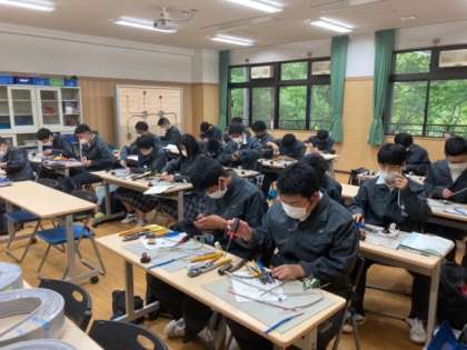 プロジェクト工学科ものづくり分野電気専攻では、受験希望者を対象とした「第一種・第二種電気工事士技能試験対策特別講座」を12月5日(月)〜23日(金)まで行っています。本講座は、プロジェクト工学科ものづくり分野・フロンティア理数科の受験希望生徒30名程度を対象に実施しています。