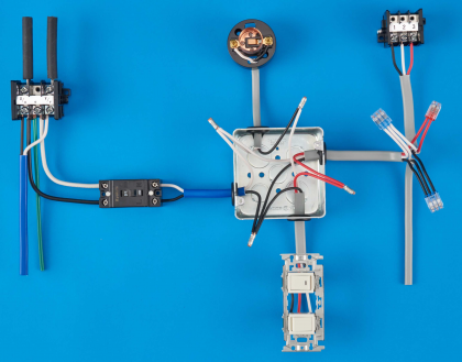 机1個分の作業スペースで迅速かつ正確に施工図・施工条件を読み取り、工事する練習をしています。施工が完了した際には、先生方からチェックを受け、振り返りなどを行います。最後は清掃を行い、講座を受講している生徒全員が電気工事のプロセスを学んでいきます。
