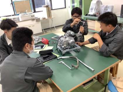 ものづくり分野メカトロニクス領域のテーマの1つである「4サイクルエンジンの始動について考察する」では、この日は、目標であるエンジンの始動を達成するために、エンジンの解体を通して機構について理解を深めました。専門的な知識や技術で、社会に貢献できる提案の実現を期待しています。