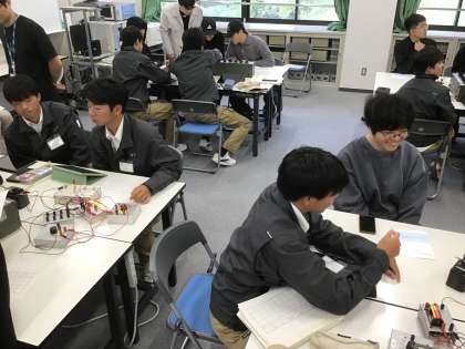 学校紹介と施設見学のあと、工業科の必履修科目である工業技術基礎の単元「電圧降下法・ホイートストンブリッジ」の授業を受講し、自己紹介を交えて時折、スマートフォンの翻訳機能を駆使しながら高校生同士の国際交流が展開され、相互理解を深めました。