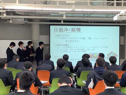 1月23日(木)1・2限、本校において電気専攻3年生29名の生徒が1年かけて取り組んできた教材や製作物、深草小学校5年生対象の授業実践に関する成果発表会を行いました。来年度への引き継ぎも兼ねて電気専攻2年生を招いての発表となりました。また、連携先の深草小学校の徳留校長先生も出席いただき、ご挨拶や生徒発表の聴講をくださいました。