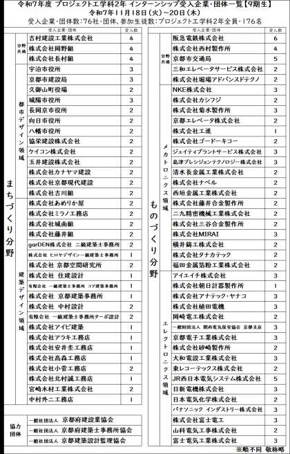 11月18日(火)〜20日(木)の3日間、プロジェクト工学科2年生がインターンシップ(就業体験)に参加しました。この就業体験を通して勤労観や職業観を醸成し、将来の進路実現に役立てることを目的としています。地元京都の製造業や建設業、官公庁等計76社・団体様のご理解とご協力を得て、参加生徒全員が学校では経験できない貴重な体験をすることができ、3日間を無事に終えることができました。