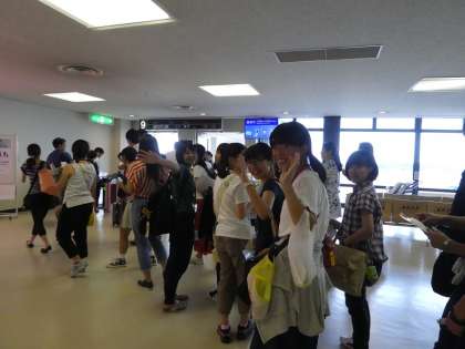 付添団代表の地蔵学年主任や加島先生,見送りに来てくださった岩佐教頭から激励をいただき,決意を新たにしていました。飛行機は13時10分に離陸し,羽田空港,ミネアポリス空港を経由しボストンへと飛び立っていきました