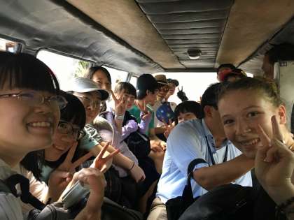 市場を後にし,「ウブド」にて,本研1つ目の班別フィールドワークを実施しました。火山の影響か、例年になく観光客が少なく、やや閑散としていました。班別FWでは、それぞれに設定したコースで芸術館やカフェを巡り、ウブドで有名なココナッツアイスクリームを食べるなどして過ごしました。予定通りウブドの班別研修が終わったとの移動は、レトロなシャトルバス。一同、びっくりな体験が出来ました。