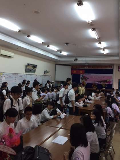 本日は午前中,「ツーヅー病院訪問」「マリキュリエ高校との交流」の2コースに分かれての活動となりました。ツーヅー病院は,下半身がつながった結合双生児として産まれたグエン・ベト[兄]ちゃんとグエン・ドクちゃん[弟]の,ドクさんが勤務されている病院です。施設内の見学としていただいた後,先日の校内募金活動で集まりましたお金をお渡ししました。(今回の活動に協力して下さいました多くの生徒・保護者・教職員の皆さん,誠にありがとうございました。)枯葉剤の影響をもった子供たちと交流することもできました。一人一人がさまざまなことを感じ・考える時間となりました。マリキュリエ高校との交流では,最初にお互いの学校紹介プレゼンテーションをしました。歌を歌ったり、折り紙をしたり,一緒にスポーツを楽しんだりと終始楽しく,充実した交流の時間を過ごすことができました。