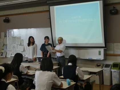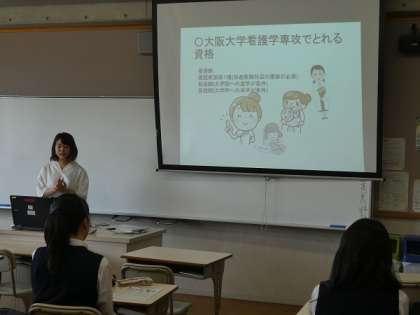 卒業生は,さまざまな高校時代の失敗や成功の体験談をはじめ,大学での研究室での様子,大学での学びについて後輩である生徒たちに語ってくれました。その後の質問では,生徒たちの疑問や興味に対して親身に答えてくれました。先輩たちは「自分のやりたいことができるように,可能性を広げるために文理選択をしてほしい」「学部や学科の名前だけで選ぶのではなく,中身を知ってから選んでほしい」とアドバイスしてくれています。