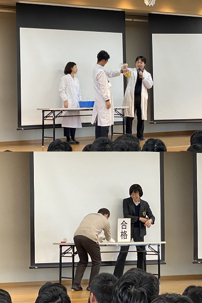 そして理科からは,「不安」を表わす濃い色の液体を無色に変え平常心を取り戻すという,化学科伝統の実験に臨みました。また,物理科からは今年度初お目見えの「合格を引き寄せる力とは?」を題材に西京生の「実力」を表現していただきました。いつもの学年集会とは少し違った,笑いも溢れる和やかな激励の言葉を各教員から贈りました。